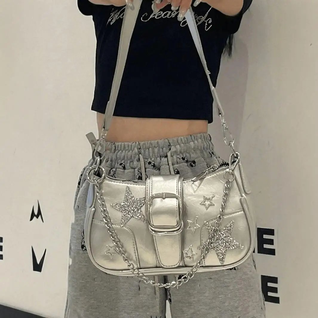 Women Y2K Star Embroidery Mini Shoulder Chain Bag
