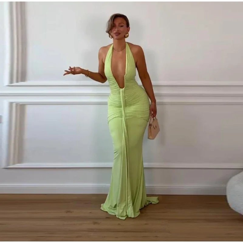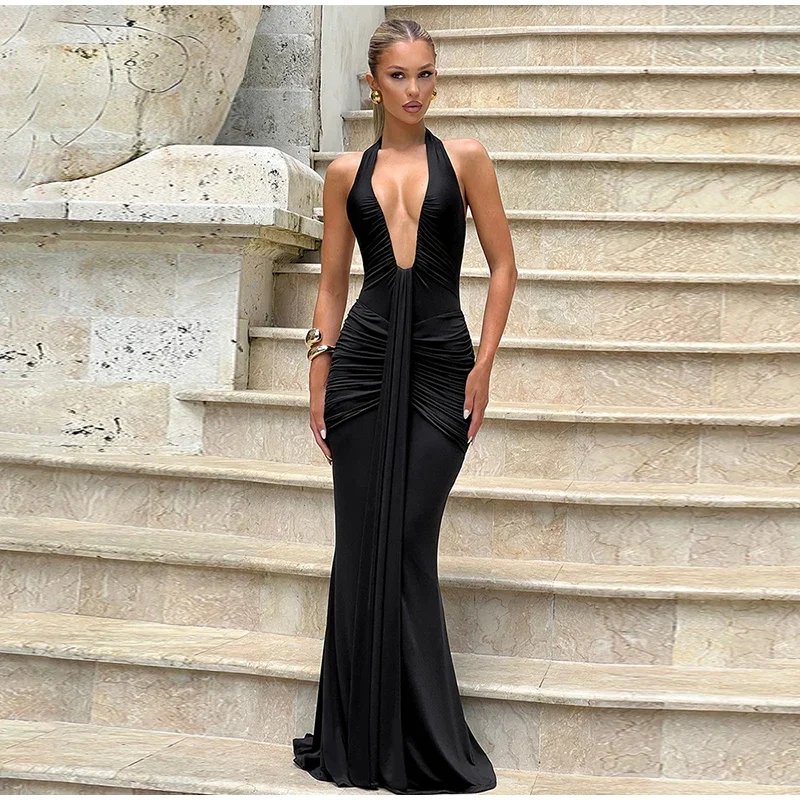 Step into the spotlight with this exquisite backless halter maxi evening dress for women, crafted to inspire confidence, elegance, and captivating allure. Designed for women who appreciate dramatic silhouettes and refined glamour, this gown features a daring deep V neckline, luxe gathered detail, and a sensual open back that ensures every entrance feels unforgettable.