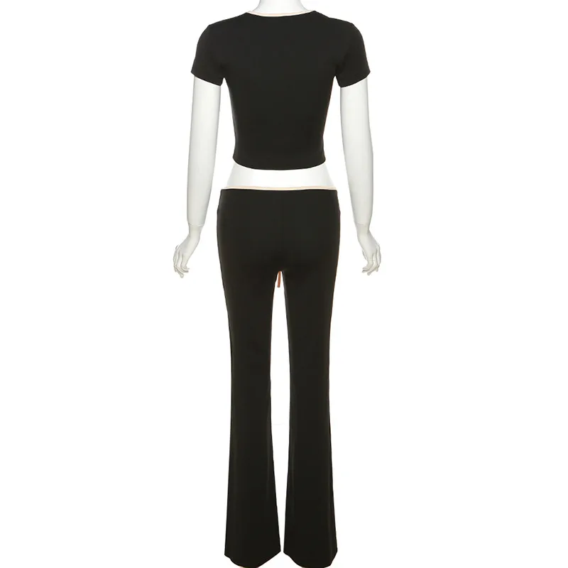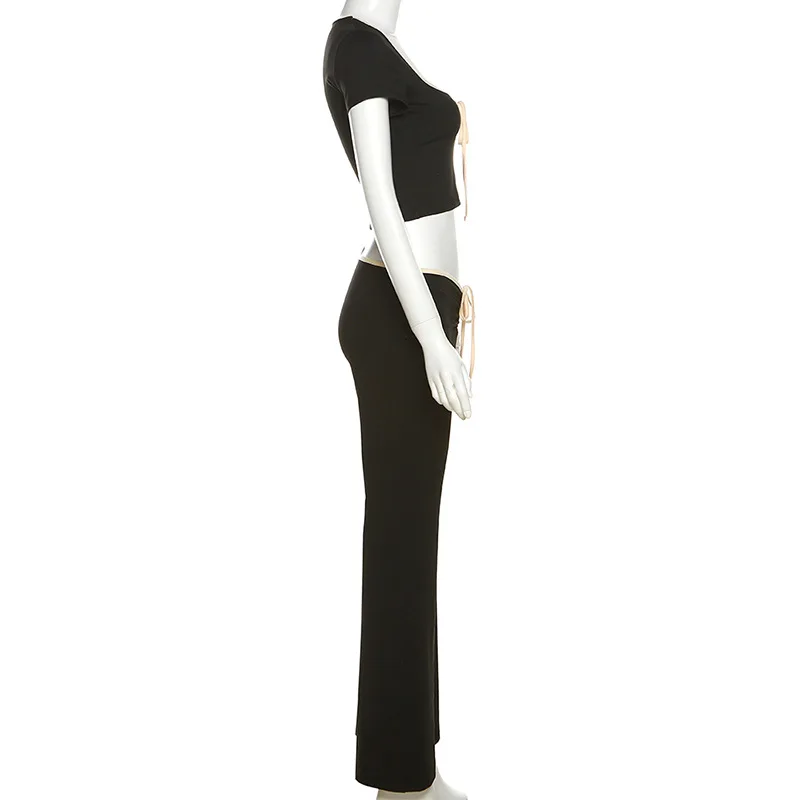 This sexy black 2-piece set is the ultimate blend of bold, chic, and trendy fashion. Designed with a daring bow tie front crop top and sleek low waist long pants, it brings together confidence and high street style in one striking outfit. The short-sleeve top features an adjustable tie closure that flatters your figure, while the slim-fit pants elongate your silhouette for a flawless, fashion-forward look.