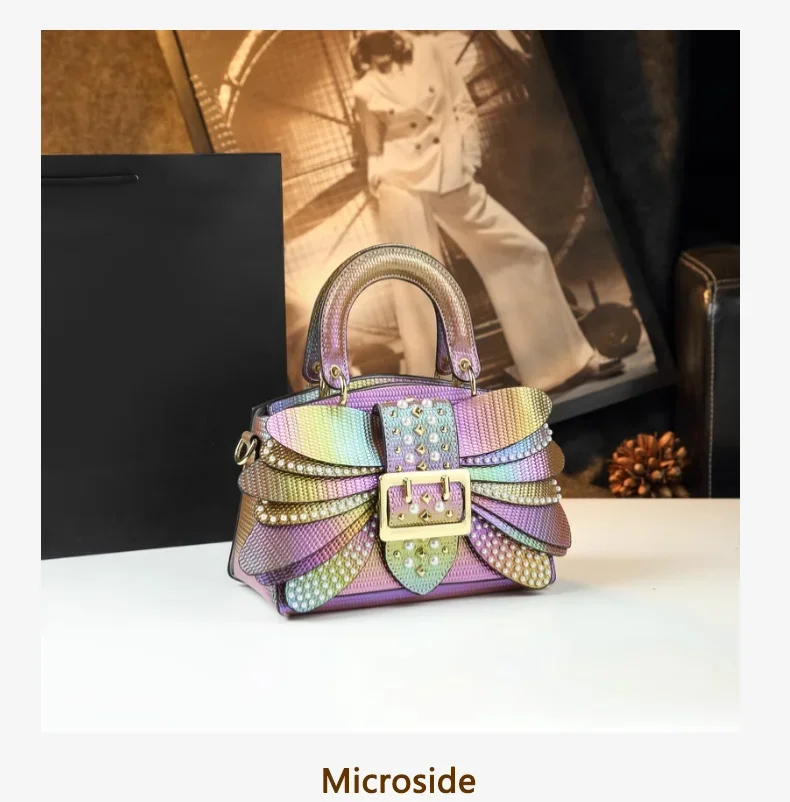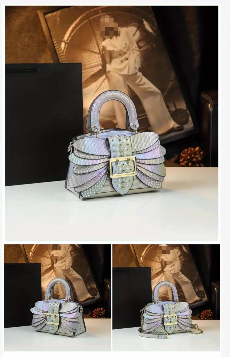 Inspired by the bold aesthetics of modern streetwear and luxury fashion, the colorful riveted wing handbag is a celebration of individuality. The rivet embellishments symbolize strength and edge, while the rainbow-like finish represents joy, creativity, and confidence. This handbag echoes the trend of fashion as self-expression, making it an instant favorite among fashion lovers who want to make a statement.