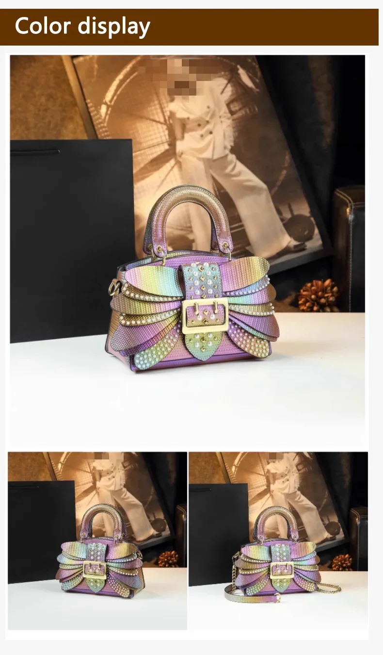 Crafted with high-quality materials, the colorful riveted wing handbag offers durability without compromising on style. The rivets are securely fixed for long-lasting sparkle, while the soft-touch faux leather exterior ensures a polished finish. The inner lining is smooth and protective, keeping your belongings safe. Its overall feel combines sturdiness with elegance, delivering both practicality and fashion-forward flair.