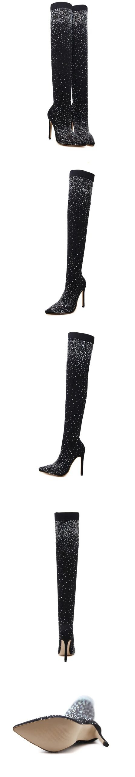 Every inch of these over the knee rhinestone boots has been carefully designed to celebrate a woman’s silhouette. The elasticized fabric hugs the legs like a second skin, creating a refined and elongated line from thigh to toe. The stiletto heel lifts your posture, giving a statuesque, confident allure, while the pointed toe adds that essential touch of sharp sophistication.