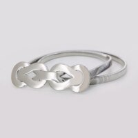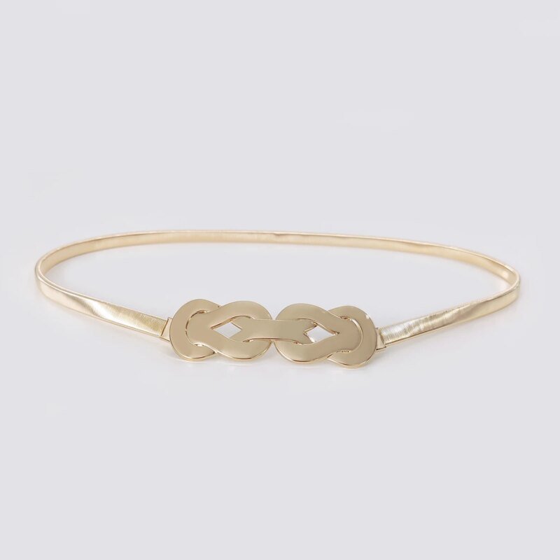 The design features a slim elastic metallic band that stretches to gently hug the waist without feeling tight or restrictive. Its highlight element is the buckle, shaped like interlinked chain loops, which gives the belt a contemporary sculptural identity. The buckle secures the belt with ease and aligns perfectly at the center, delivering symmetry and a visually defined waistline.