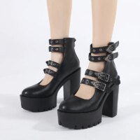 Designed with multiple buckle straps and a secure back zipper, these shoes blend classic Mary Jane silhouette with punk-rock edge. A chunky 23cm platform heel gives you towering height while keeping comfort in check, thanks to their stable block base. Each detail—from the metallic hardware to the cut-out vamp—speaks to a fierce and fashionable aesthetic.