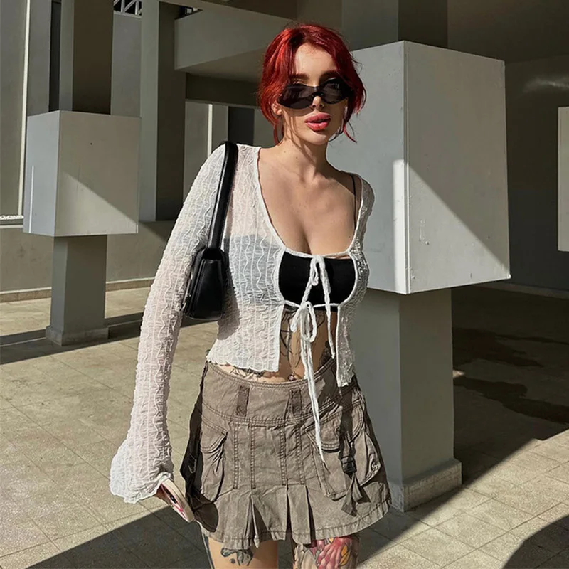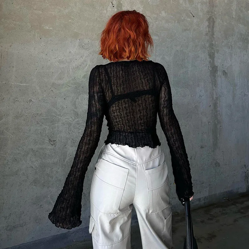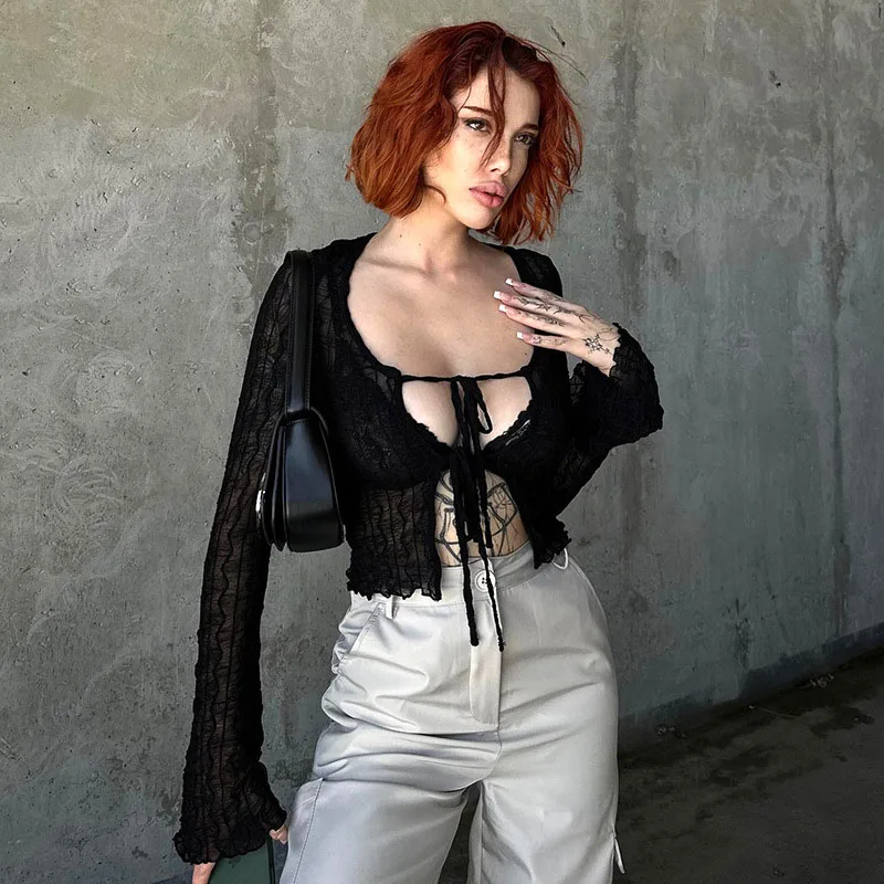 Inspired by gothic, fairycore, and Y2K grunge aesthetics, the mesh lace-up crop top reflects some of the most popular fashion movements of today. Its transparent lace-up design has been spotted on runways and embraced by influencers, cementing its status as a must-have for alternative fashion lovers. The balance of gothic edginess and sheer femininity makes it suitable for countless styling possibilities.