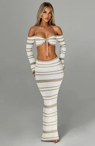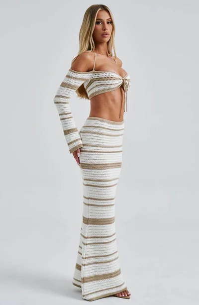 The coordinating maxi skirt continues the theme with a figure-hugging cut that elongates the frame. Striped accents in bold black and white create a chic balance of minimalism and drama, offering a look that is perfect for both day and night. The length of the skirt adds elegance while the fitted design ensures a sexy yet sophisticated vibe.