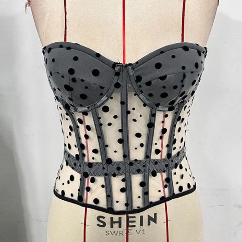 The lace mesh corset top is crafted from soft, high-quality lace and reinforced mesh, offering both sensual transparency and lasting durability. The outer fabric is breathable and feather-light, perfect for summer nights and late-night glamour. The interior lining provides coverage where needed and ensures a comfortable fit against the skin.