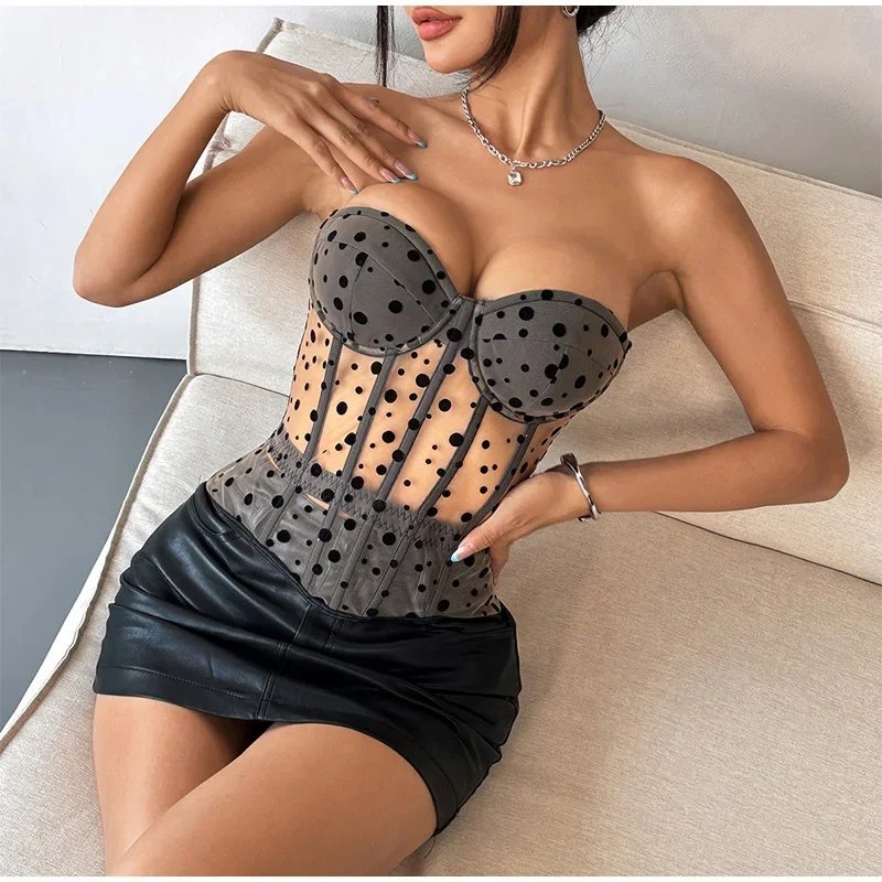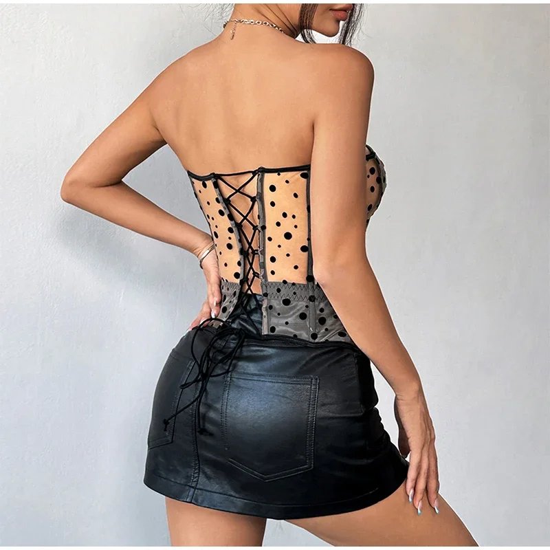 Dare to stand out in the strapless lace sheer corset top — a sultry statement piece designed for confident women who own their look. With its figure-sculpting bandage waist, intricate lace fabric, and bold see-through styling, this top combines modern glamour with timeless sensuality. Whether you’re headed to a club, rooftop soirée, or romantic dinner, this corset promises to elevate your evening wardrobe to new levels of sophistication and allure.