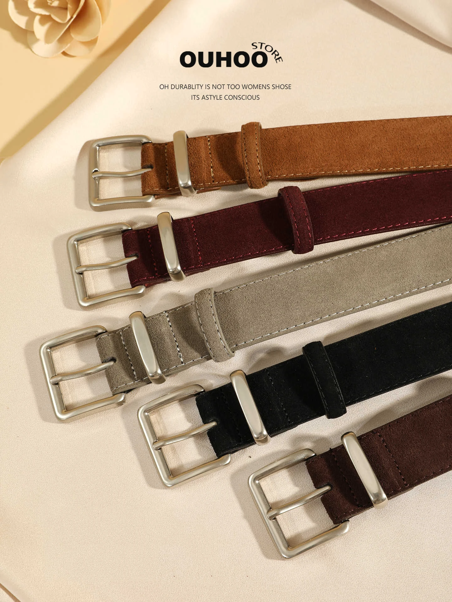 Each belt is expertly cut from genuine suede leather, ensuring durability and a tailored fit that molds naturally to your body over time. The texture of the suede adds depth and character, while the neutral tones — from rich burnt orange to deep black and chocolate brown — complement any wardrobe palette.