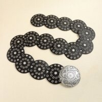 Designed for women who love distinctive accessories with presence, the belt balances substantial metal hardware with smooth, comfortable backing so it sits beautifully without stiffness. The rhythmic pattern of discs, the artful studwork, and the warm patina evoke collectible vintage finds, while the adjustable closure allows you to customize the fit for multiple looks, seasons, and body shapes. From daytime denim to evening satin, it brings a luxe finishing touch that reads editorial yet wearable.