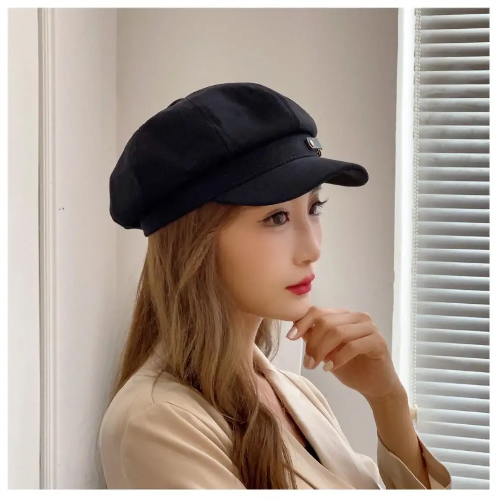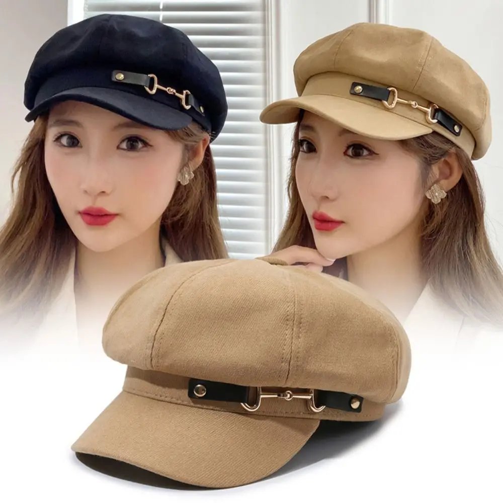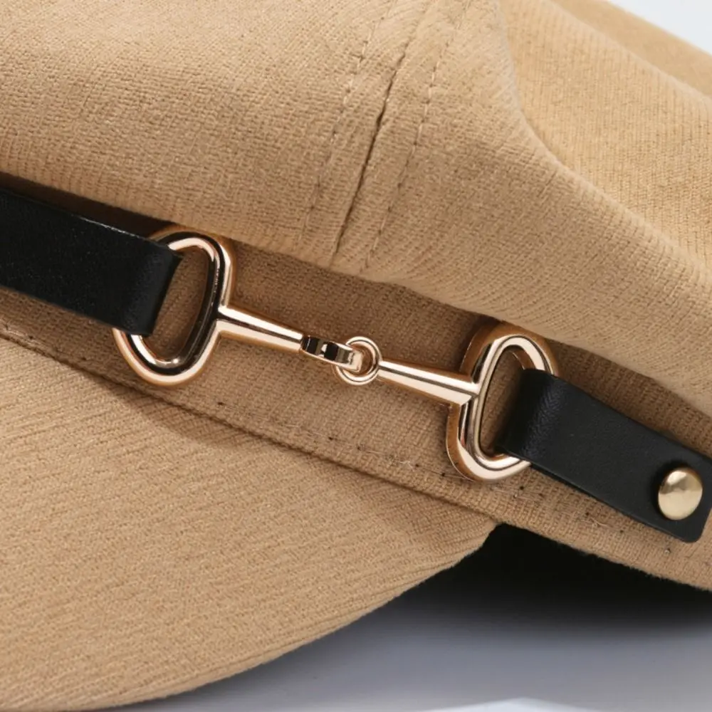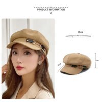 The design of this wool beret hat draws inspiration from the timeless newsboy and paperboy styles of the early 20th century, reimagined for today’s fashion-conscious woman. Its octagonal top structure and short brim create a flattering frame for the face, while the adjustable band ensures a perfect fit for every head size. The front is detailed with a sleek faux leather strap and metallic accent, adding a subtle hint of modern sophistication to its vintage appeal.
