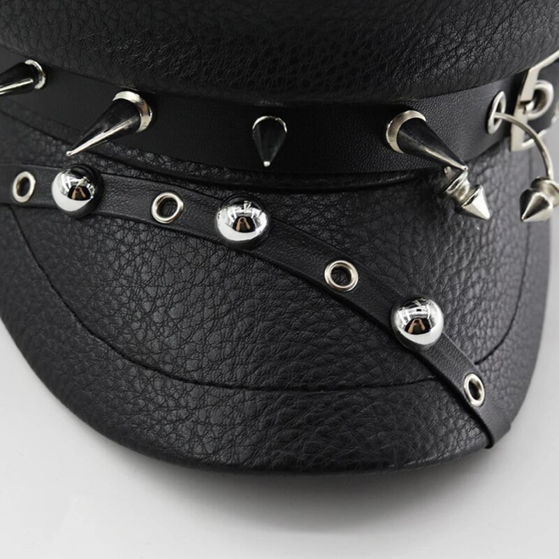 With its flat-top silhouette inspired by classic military caps, this beret merges structured sophistication with contemporary boldness. Each detail—from the polished metal studs to the smooth PU leather texture—contributes to a design that feels both luxurious and daring. Whether you’re styling for a music festival, a night out, or a creative fashion shoot, this hat adds attitude and allure to every look.