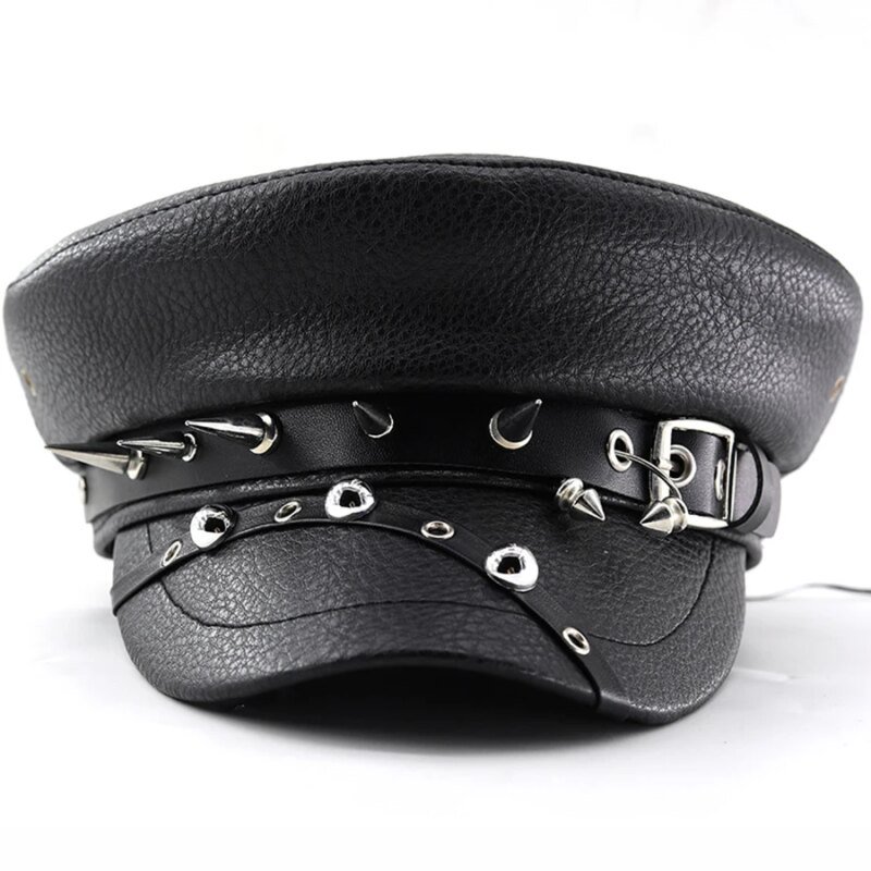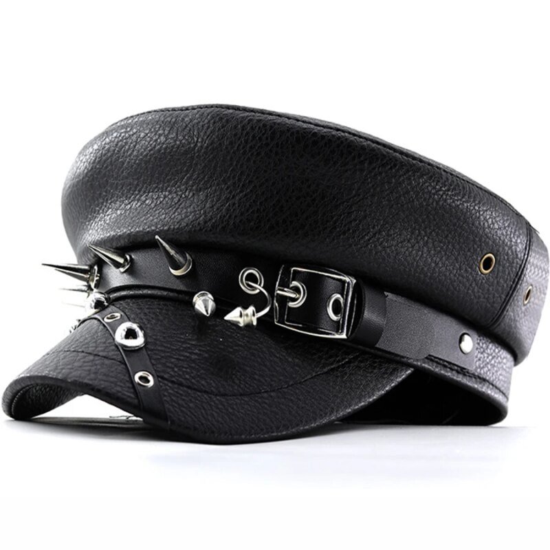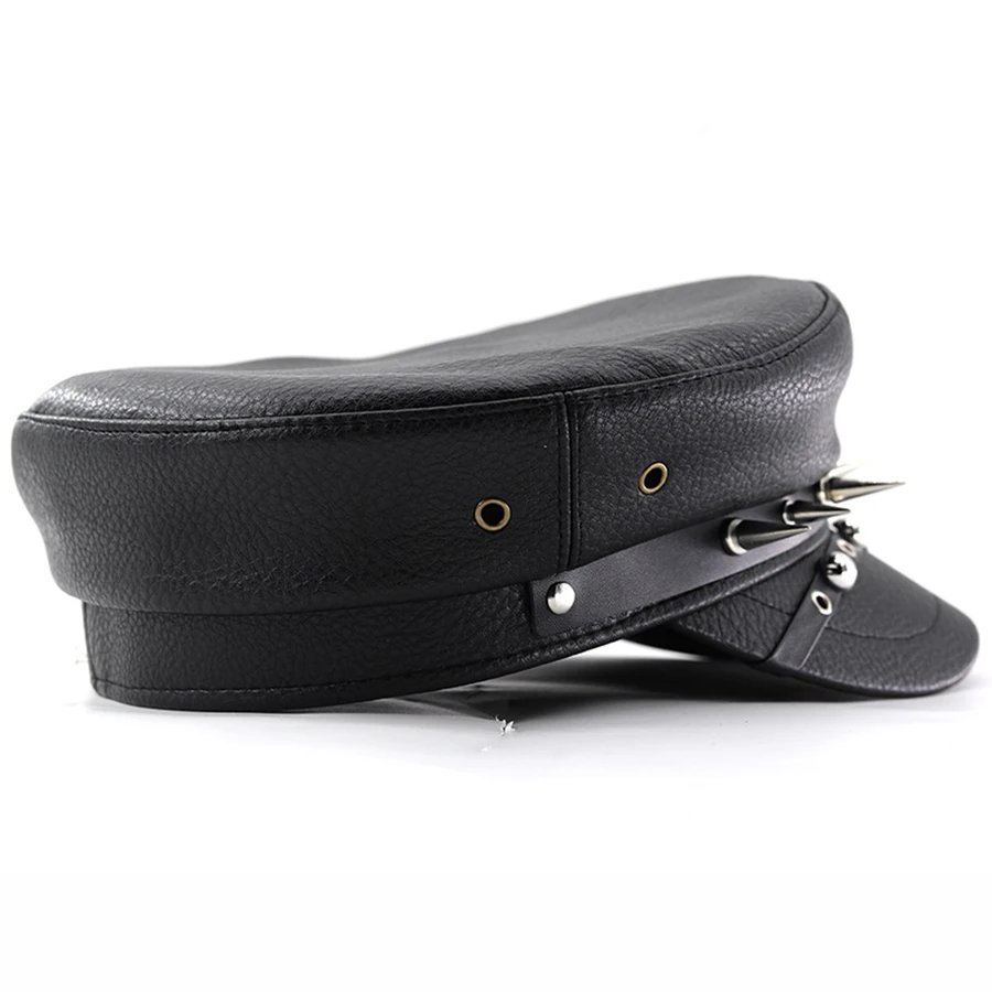 Command attention with the women PU leather captain military beret hat, a statement accessory that fuses authority, rebellion, and refined style. Crafted in sleek black faux leather and adorned with metallic spikes and a buckle belt accent, this cap embodies modern edge and fearless fashion energy. It is designed for women who lead trends rather than follow them, offering a unique way to elevate both streetwear and high-style ensembles.
