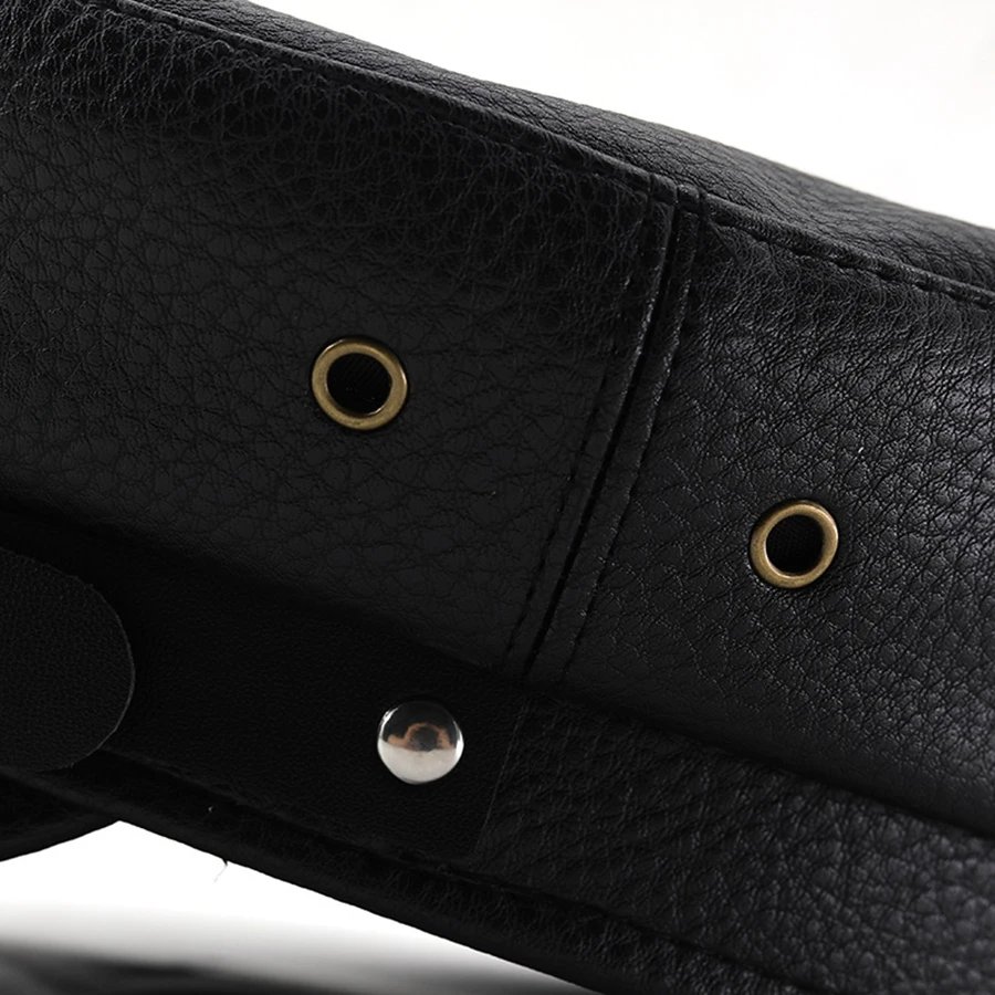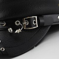 The black PU leather surface is smooth, subtly textured, and designed to hold its form beautifully. Metal spike embellishments and a decorative buckle belt wrap around the base, introducing a rebellious edge that catches the eye without overpowering the outfit. This combination of polished hardware and matte leather effect creates a sophisticated contrast, making it an ideal accessory for confident, style-driven personalities.