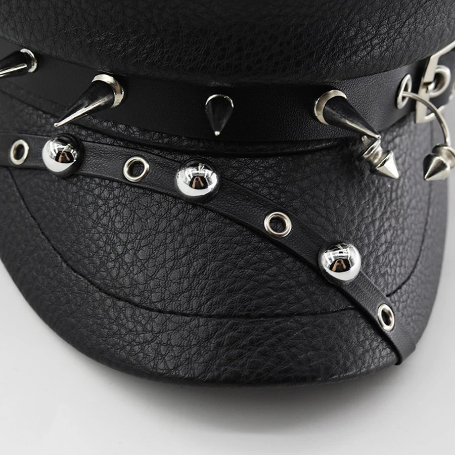The black PU leather captain hat draws inspiration from classic naval aesthetics, reimagined through a modern punk-rock and street fashion perspective. It channels a spirit of strength and creativity, appealing to women who express themselves through bold fashion choices. The hardware detailing speaks to a rebellious energy, while the structured silhouette maintains polish and sophistication.