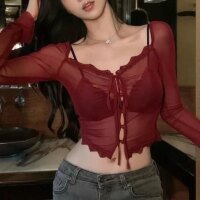 Lace has long been celebrated in women’s fashion for its delicate elegance and sensuality. This blouse takes inspiration from timeless lace trends while adding a modern twist through sheer mesh and a tie-front silhouette. Burgundy-red shades have historically symbolized luxury, passion, and refinement, making this piece not just a garment but a statement of confidence and individuality.