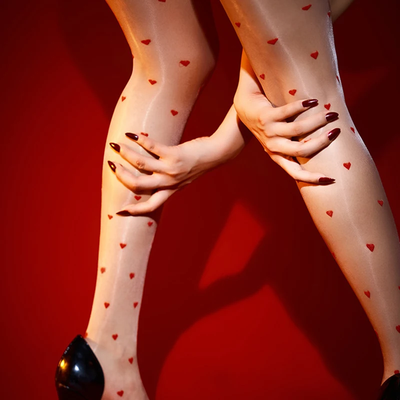 Every step shimmers with a subtle, oil-gloss finish that highlights the legs’ natural contours, while the delicate dot-heart details add a touch of playful charm. Whether paired with a cocktail dress, a chic skirt, or intimate eveningwear, these stockings bring out your inner allure with timeless style.