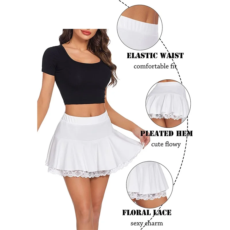 Chic pleated mini skirt with lace ruffle trim, high waist fit, and flared design. Perfect for Lolita, Japanese, and summer fashion outfits.